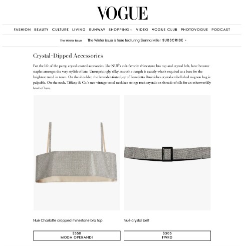 For the life of the party, crystal-coated accessories, like NUÉ’s cult-favorite rhinestone bra top and crystal belt, have become staples amongst the very stylish of late.